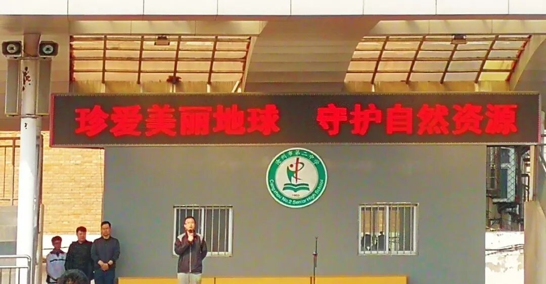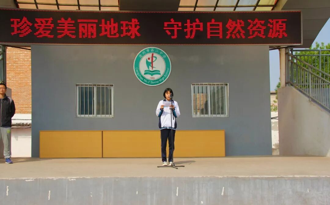 4月22日,在世界地球日到来之际,高一17班杨馨月在升国旗仪式结束后作题为《爱美丽地球 守护自然资源》的演讲,向同学们发出节约资源、保护环境,做保护地球的主人的号召。