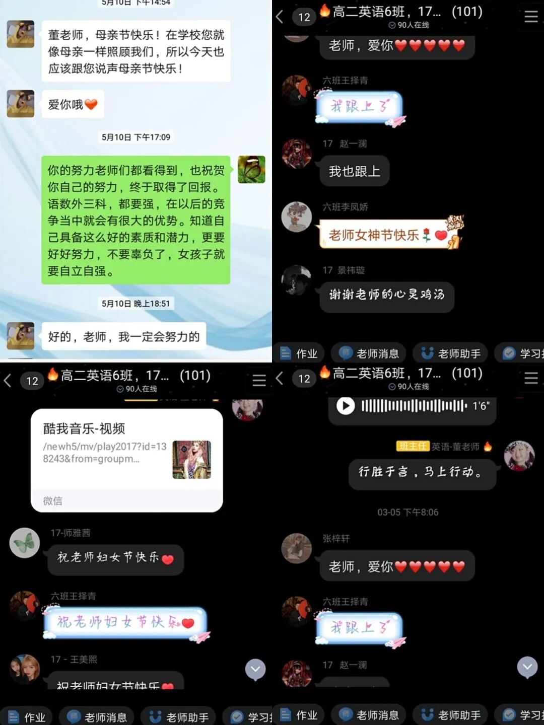此外董老师不忘对学生进行思想建设的培养。她定期召开主题班会,在疫情最严峻的阶段,以感人的医护人员逆行报国的具体事件告诉孩子们,要用知识武装自己的头脑,回馈社会;在同学们长期网课开始懒散懈怠时,董老师推送了关于方舱医院的高三生和山区孩子艰难上网课的案例,让同学们意识到自己具备这么优越的物质条件,没有理由不用功学习;在三八节和母亲节时,董老师又倡导学生们理解妈妈的辛苦和不易,在珍贵的和妈妈共度的节日里,为妈妈多做些家务,表达自己的感激……