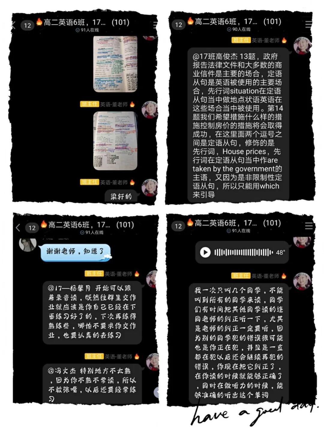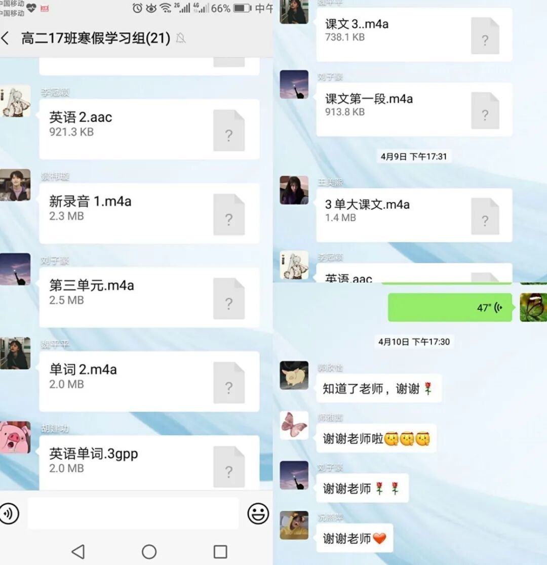 疫情期间与学生无法面对面交流,听不到同学们早上朗朗书声,看不到一张张或整齐或有空缺的试卷,老师的心里始终是不安的。直播课堂中,线上听写、正课讲授、课上提问、线上答疑,董老师把课堂教学安排得紧张活泼而有序,调动学生的学习兴趣和热情,让学生在单位时间内能够最大程度地吸收当堂课的知识点。云端教学,让课后辅导变得困难。课下,董老师利用软件,逐一核对学生作业内容和数量,批阅学生当天作业,看课上听写,查学生朗读,并及时给予指点,进行有针对性的点评和反馈,落实到每一个学生。