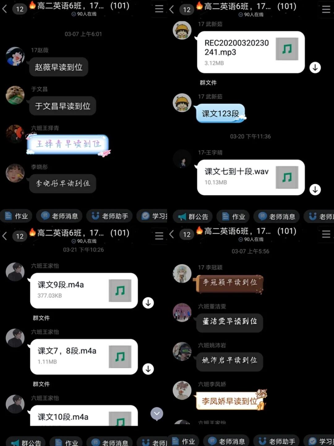 一场突如其来的新冠疫情打乱了正常的学习和生活节奏,“线上教学,线下管理”对于教师家长和学生来说是一场前所未有的挑战,而班主任的任务就更为艰巨。班主任的工作量大且繁琐,尤其在疫情期间,董老师一边叮嘱家长做好日常体温监测并统计数据,一边传达疫情防控的通知并及时推送时事评论给学生观看。作为班级的管理者,董老师每天早上按时给学生发送晨读任务,统计班上同学的早读情况,关注课堂的出勤率,作业的完成情况和限时测的答题情况。