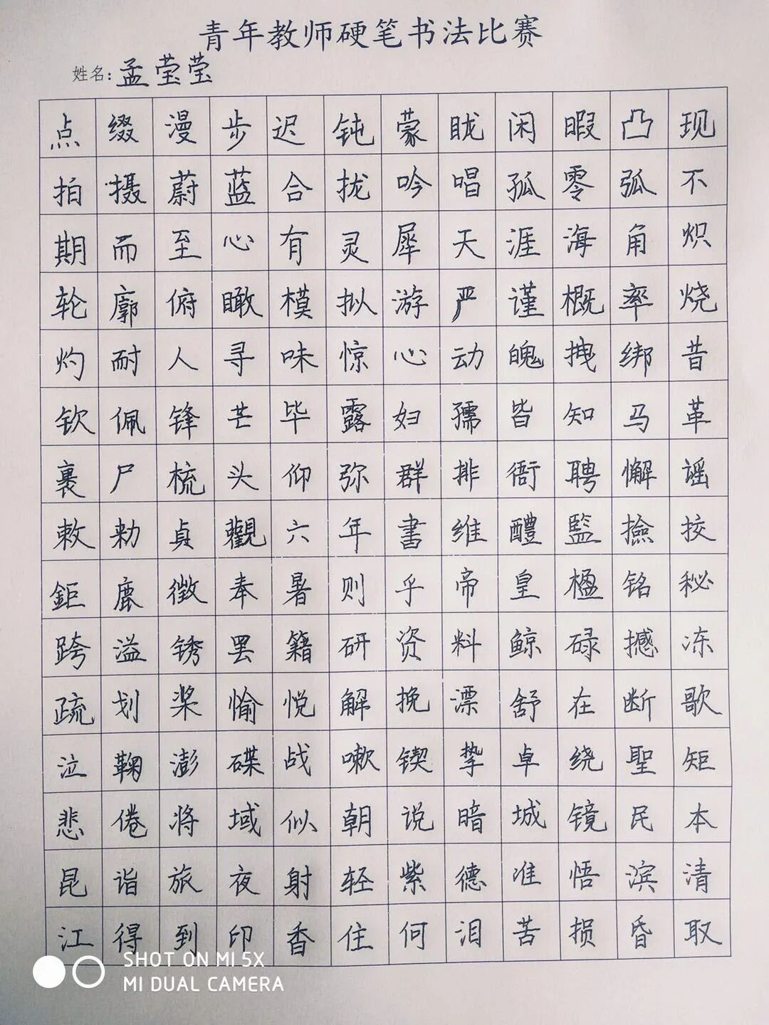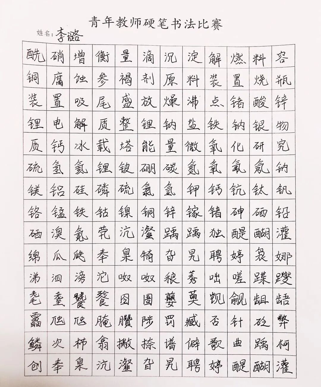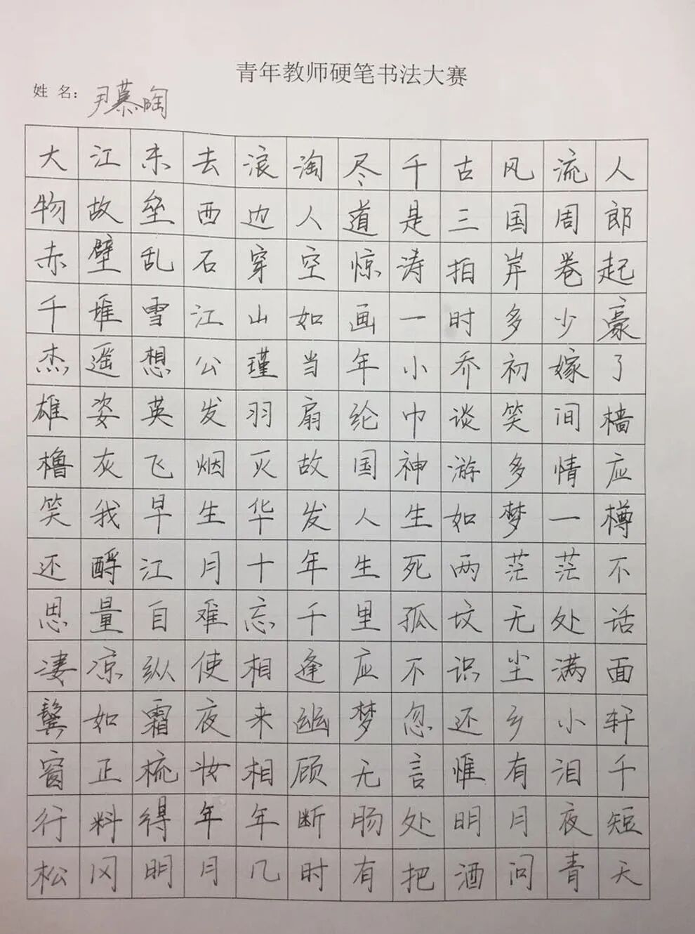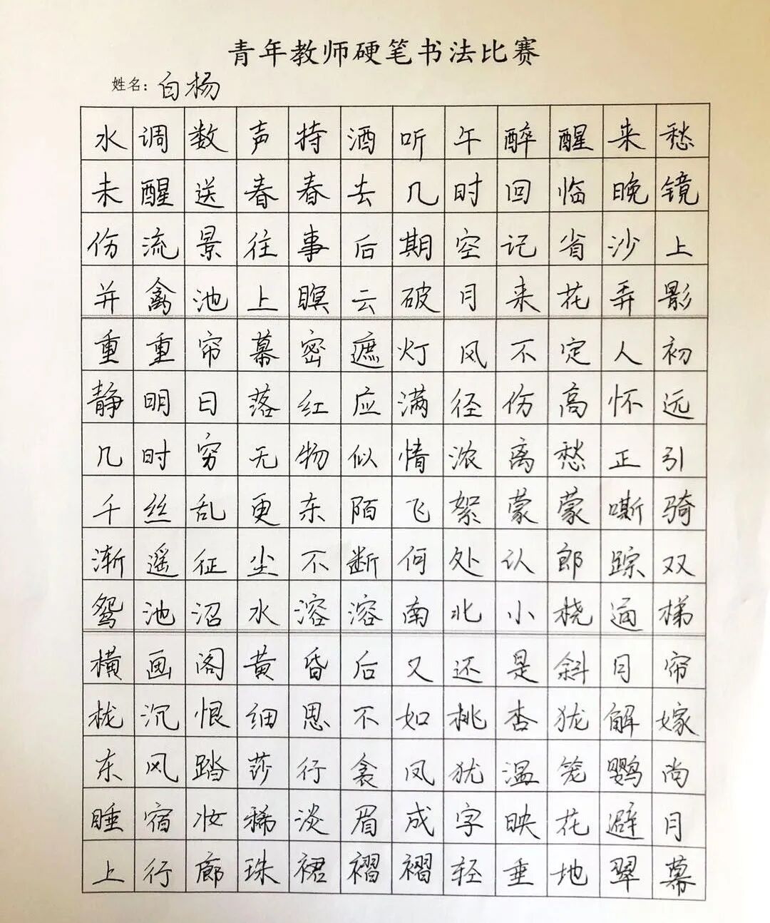 语言和文字是教师和学生日常进行交流的两大手段。能写一手漂亮的字是对教师的基本要求。隽秀的字迹能走进学生的心灵。教师只有规范、美观地书写,才能正确的引导学生、才能对学生产生潜移默化的影响。本次比赛要求在规定时间完成,书写美观,无错别字,间架结构合理,行笔流畅。书写的过程是自我沉淀的过程,也是提高自身修养的经历。青年教师们认真对待,纷纷表示要以这次比赛为契机加强书写训练,不断提高自身的书写能力。