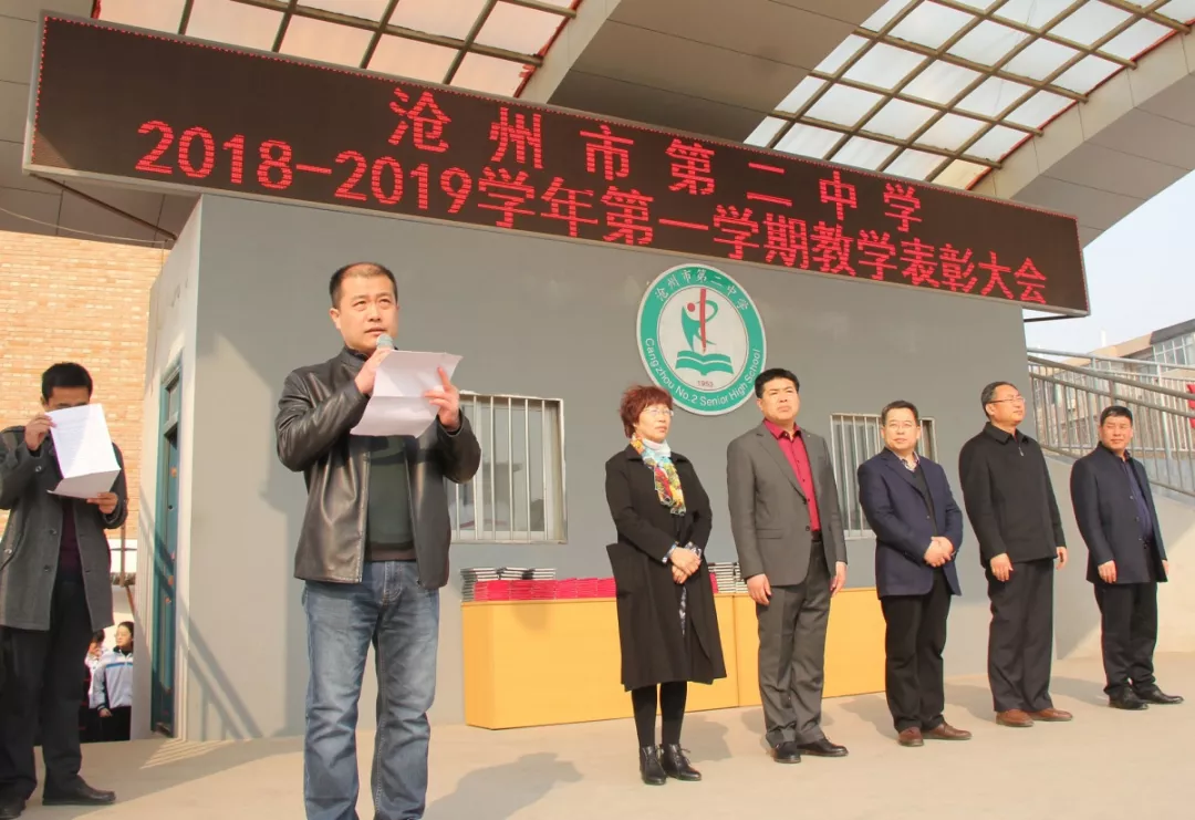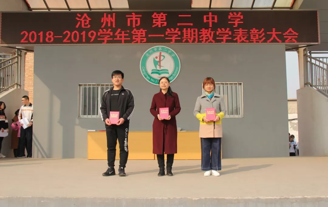 3月18日,升国旗仪式结束后,我校举行2018—2019学年第一学期教学表彰大会。表彰100名成绩优异的同学并颁发奖学金,对统考成绩优异的班级、备课组进行表彰,对教学教研成绩特别突出的的高三物理组、高三数学组、高三英语组团队以及三位组长颁发教学教研特殊贡献奖。出席表彰大会的领导有校长韩宝祥、副校长刘宝国、郑锦侠、乔巨辉、胡永生,工会主席王喜芹。教务处主任崔金栋主持大会。