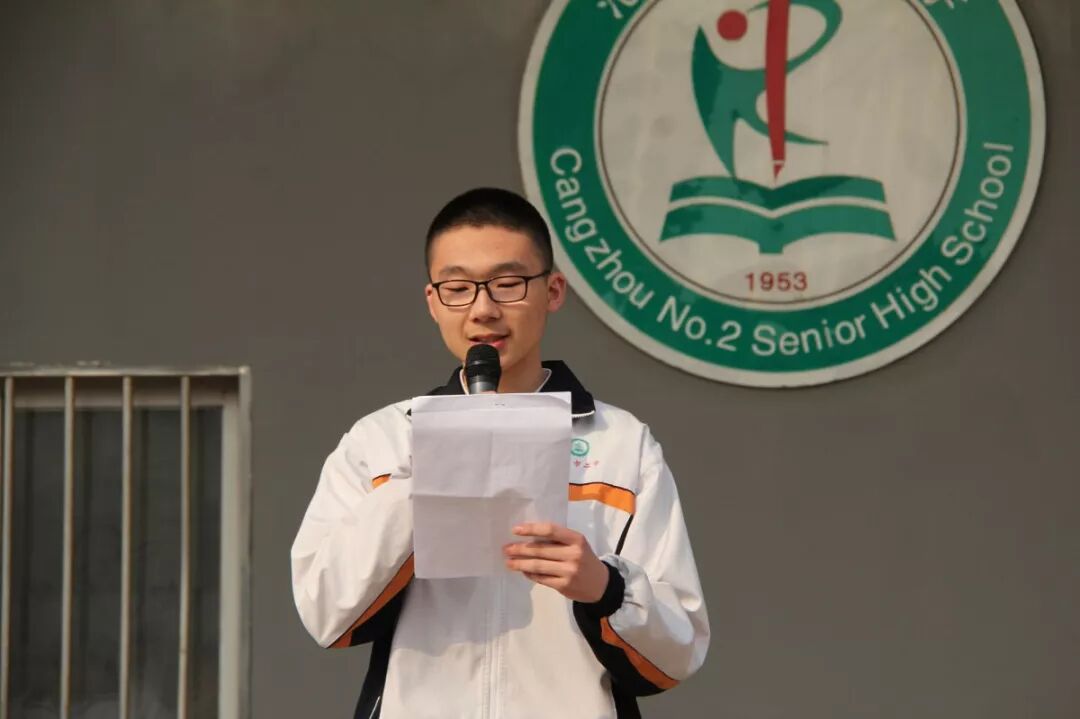 高三17班张桓翊代表学生发言,他回述了自己不理想的中考成绩和一次次在老师们的勉励下不断提升直至全年级第三名成长经历。他勉励学弟学妹们要自信的、努力的前行,终将会梦想成真。激励高三的同学做好知识和心理的准备,培养耐挫力和自信心,勇往直前在高考中如愿以偿。