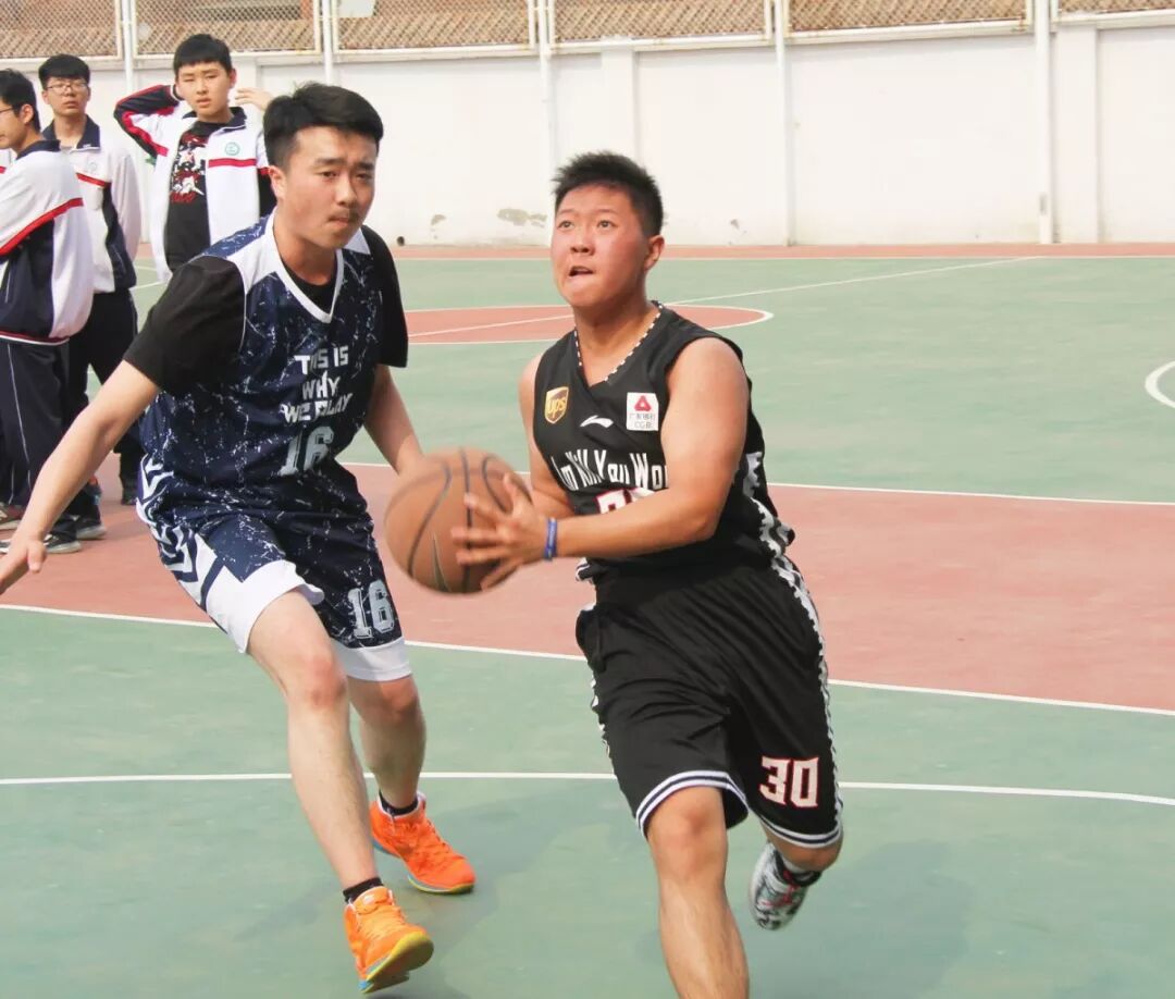 篮球赛场上的双方拼抢很激烈,带球、运球、投篮等一系列动作潇洒、规范,引来围观同学一阵阵地喝彩。
