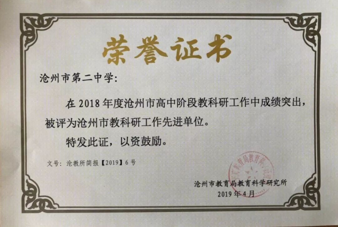 沧州市第二中学荣获2018年度沧州市教科研工作先进单位