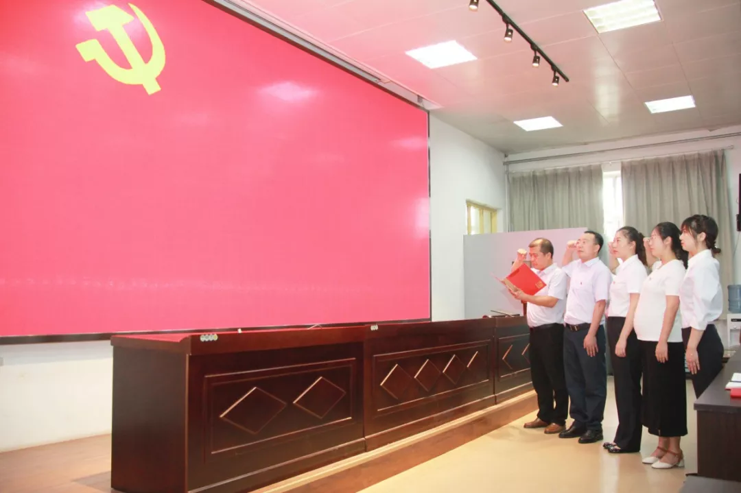 表彰结束后,党委组织委员胡永生(左一)同志带领新加入党组织的佟瑞利、王鹏颖、刘傲然、宛灵芝4名同志,面向党旗进行庄严宣誓。