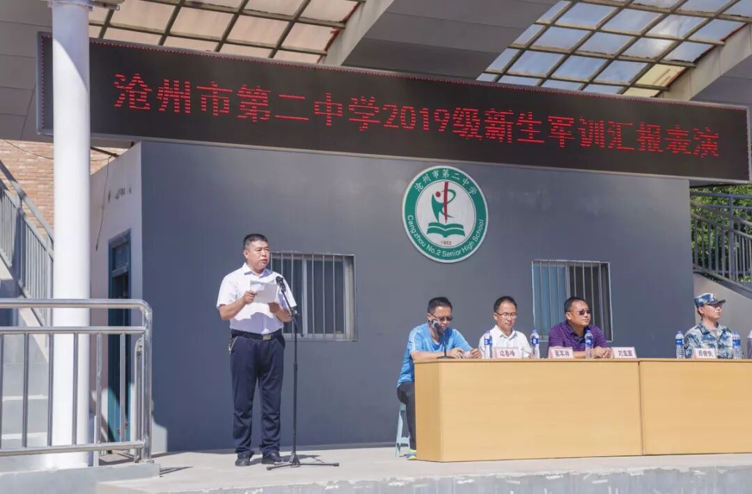 天高云淡,秋风送爽。8月29日上午,沧州市第二中学召开2019级高一新生军训总结大会。出席大会的领导有副校长刘宝国、郑锦侠、乔巨辉,工会主席王喜芹。学生处兼高一年级部主任边春峰主持大会。
