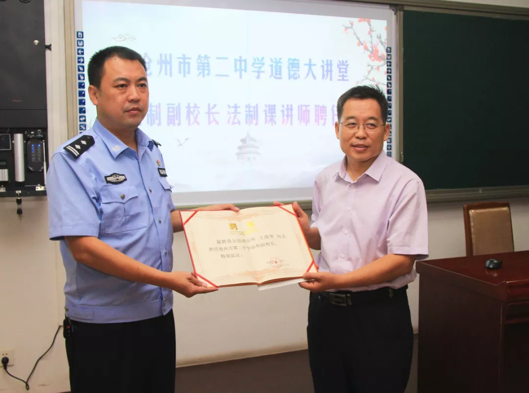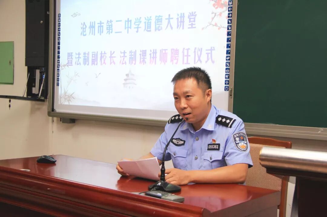 秋风送爽,金菊飘香。9月10日下午,我校道德大讲堂暨法制副校长、法制课讲师聘任仪式在学术报告厅举行。沧州市第二中学党委书记、校长韩宝祥,沧州市运河公安分局公园派出所所长王清华,副所长徐伟方,沧州市第二中学副校长郑锦侠,学生发展中心主任杜瑞庆,沧州市运河公安分局公园派出所干警杨杰等出席活动,学生发展中心张磊老师主持聘任仪式。