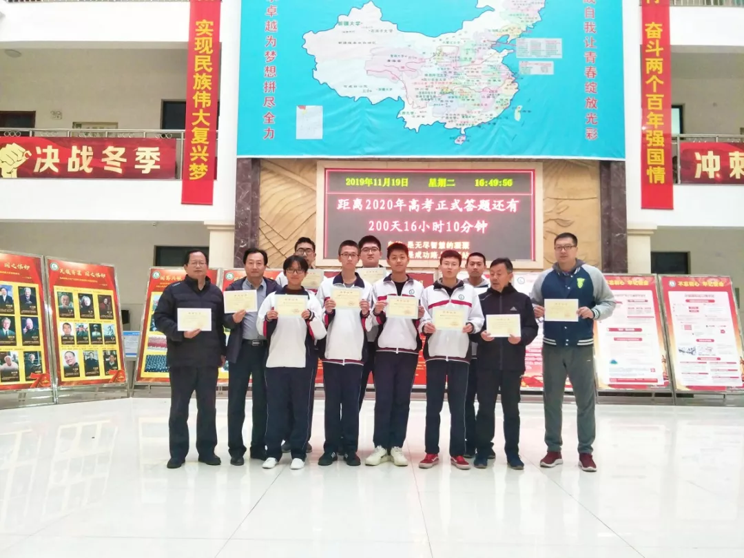 本次竞赛我校选拔出七人的比赛队伍,他们是高三1班常好、程家驹,高三3班郭瑞祥、刘琛,高三6班郭梓涵,高三7班吴树国,高三9班周赫鹏。经过赛前精心准备以及比赛中的充分发挥,我们参赛的七人全部获奖,取得优异成绩。王金轩、梅玉明、周炳义,葛立运老师获得优秀指导教师奖。