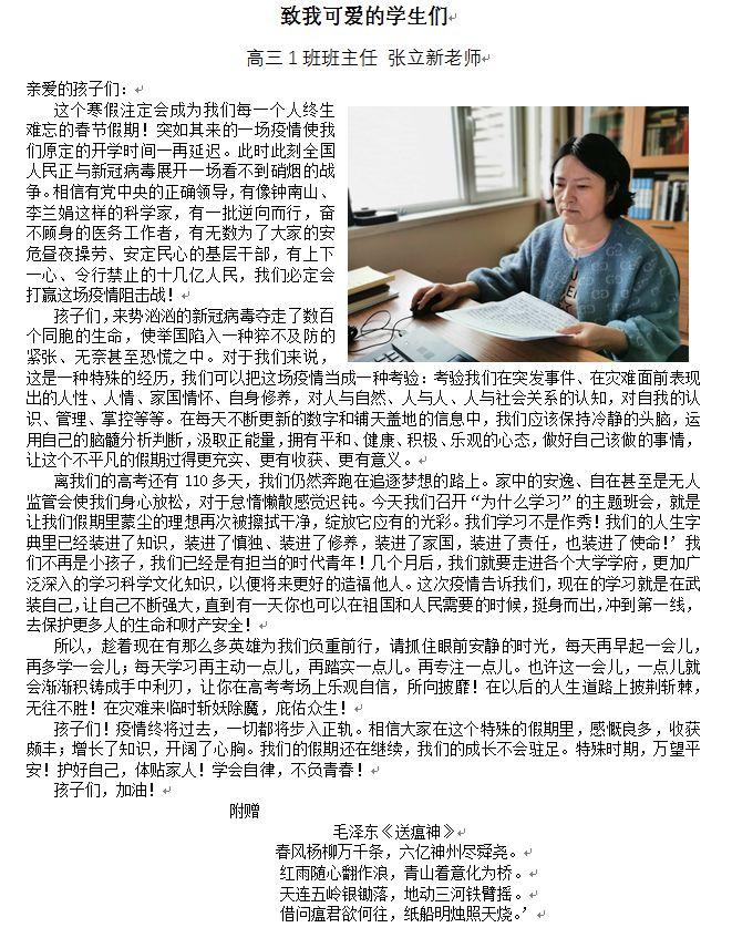 乌云遮不住升起的太阳,疫情挡不住春天的来临。士不可以不弘毅,任重而道远。希望同学们都能够成为一名有家国情怀、懂得敬畏生命、有责任担当的新时代青年,共同守护我们的家园。
