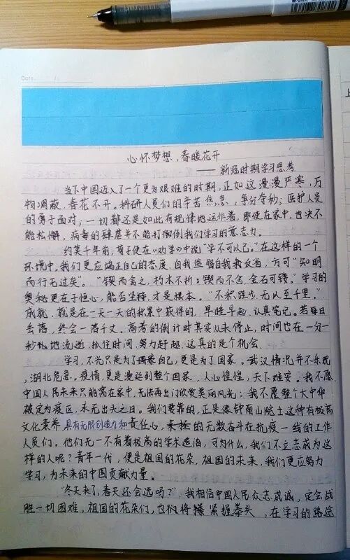 我想上面也是热血的你们都拥有的梦想。你想成为什么样的人,你就会成为什么样的人。基于这样的共鸣,我更希望大家思考的重点是——在没有教室,没有老师,没有同学的时空里,如何不虚度、不迷茫、不浪费、不颓废。当无数发光的逆行者在前线冲锋陷阵,冒着生命危险与病毒斗争的时候,我们除了居家保护自己,不添乱之外,还应做什么?