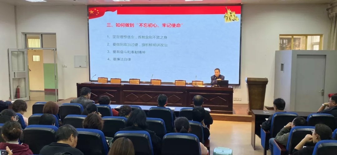 按照市教育工委对第二批“不忘初心、牢记使命”主题教育的安排部署,10月23日下午,我校党委书记韩宝祥同志组织全体教职工开展了一堂关于“不忘初心、牢记使命”的主题教育专题党课。