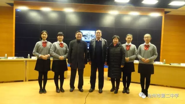四位辩手与我校校长韩军(左三)和市教育局副局长刘建成(中)、语委办主任韩四新(右三)合影