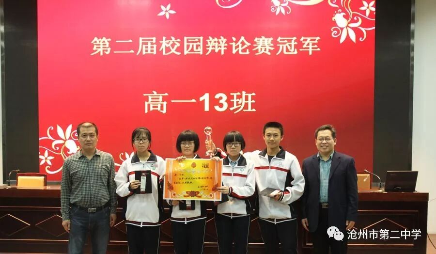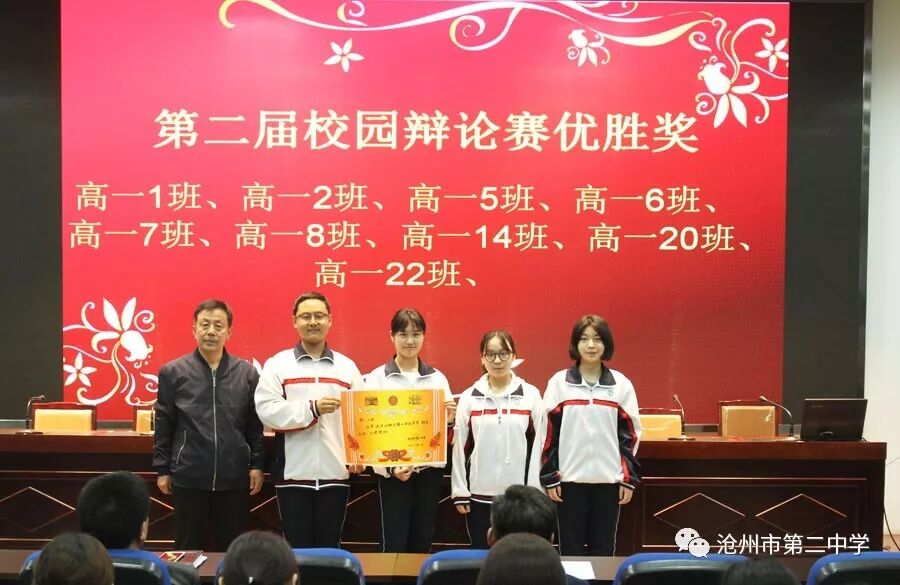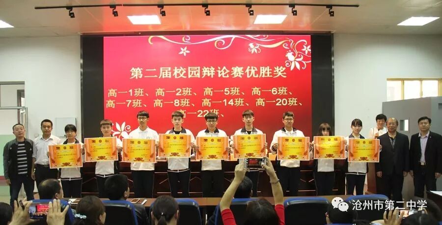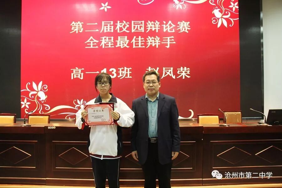 首先,给高一1班等9个班颁发优胜奖,给高一4班、高一15班、高一13班分别颁发季军、亚军、冠军奖项。然后,颁发优秀辩手奖项,获得全程最佳辩手的是高一13班赵凤荣同学,她代表全体辩手发言:感谢赛事为我们搭建良好平台,让我们在活动中成长。