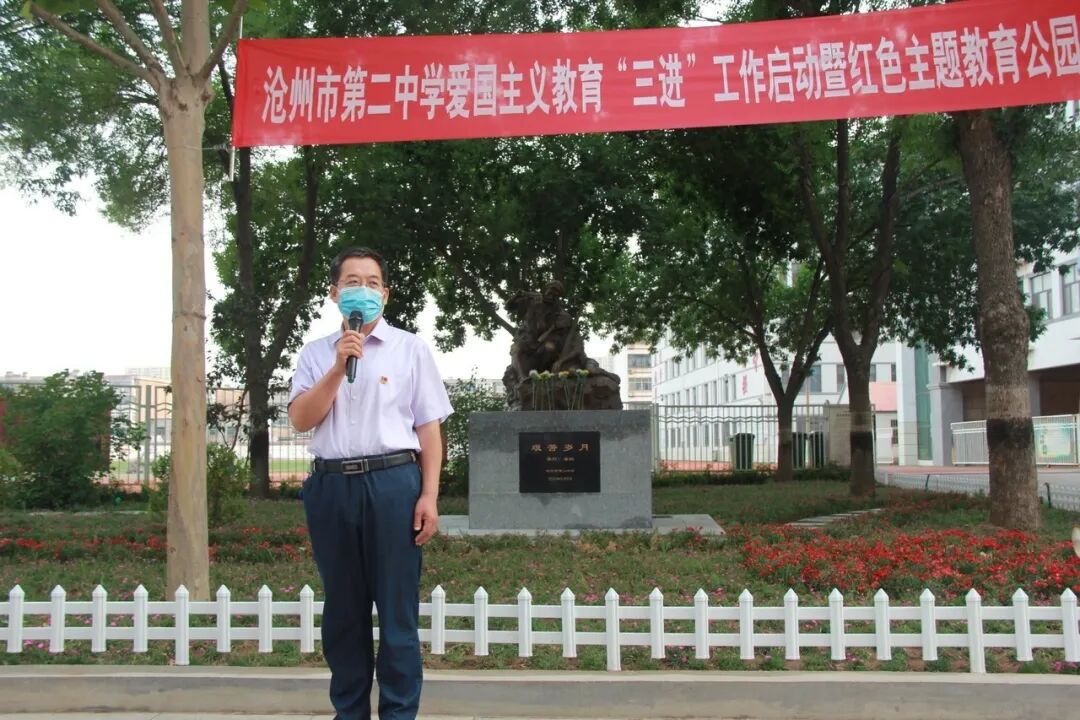2020年6月6日上午,沧州市第二中学举行爱国主义教育“三进”工作启动暨红色主题公园开园仪式。参加仪式的人员有沧州市第二中学党委书记、校长韩宝祥,德育副校长郑锦侠,教学副校长胡永生,团委书记杜瑞庆,副书记葛立运,高一年级部主任边春峰,副主任窦军祥,高二年级部主任苗杰,副主任张英彬,高三年级部主任崔金栋,副主任周庆,艺体办主任马军,副主任张华、胡志伟和其他老师以及高一高二全体青马工程学员及各班学生代表,边春峰主任主持。