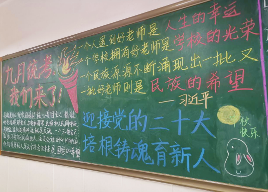 教师节来临之际,各班开展丰富多彩的活动,教室外绚丽多彩、生动活泼、内容充实的白板处处洋溢着教师节的氛围。一笔一划饱含浓浓情意,一字一句书写心中感恩。教室内黑板上主题鲜明,感恩的话语娓娓道来,诉说着对老师的无限感激与深情,表达着深深祝福与美好祝愿。