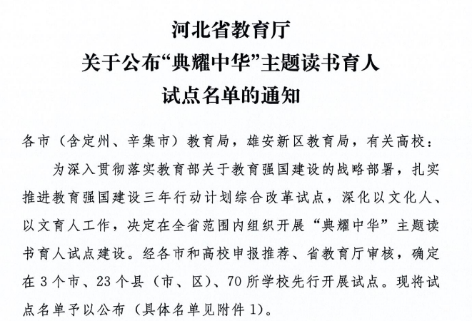 佳音再传,文脉承新。我校成功入选河北省“典耀中华”主题读书育人改革试点学校!