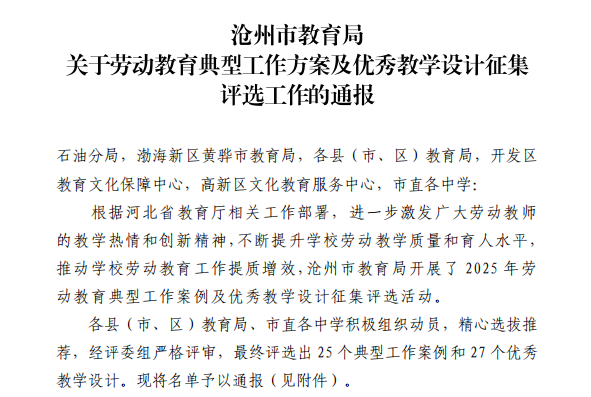 我校高度重视劳动教育,着力提升教学质量与育人水平,切实推进“五育融合”落地见效。在扎实的工作基础上,由边春峰同志负责的劳动教育典型工作案例,以及门汝倩老师的劳动教育优秀设计,在沧州市教育局2025年相关征集评选活动中双双荣获一等奖。其中,门汝倩老师的教学设计已成功入选省级优秀教学设计榜单。